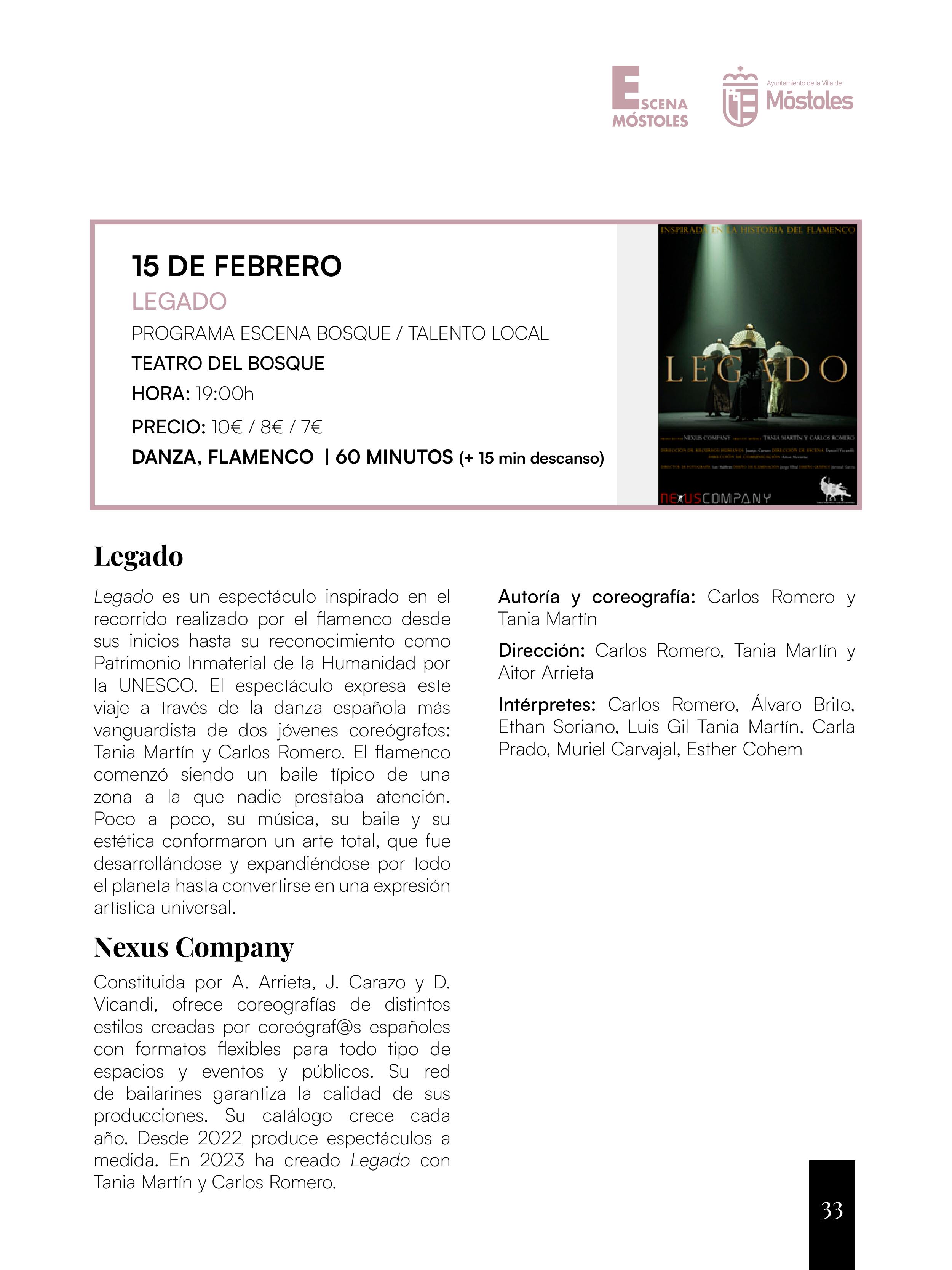 Y sábado 15, a las 19:00 h, el Teatro del Bosque acogerá "Legado", un espectáculo de danza de la compañía Nexus Company dirigido por los artistas locales Tania Martín y Carlos Romero junto a Aitor Arrieta. En él se realiza un recorrido del flamenco desde los inicios del flamenco hasta su declaración como Patrimonio Inmaterial de la Humanidad por la UNESCO.