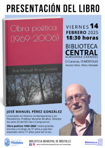 El viernes 14 de febrero se podrá asistir a la presentación del libro de José Manuel Pérez González, "Obra poética 1969-2006", a las 18:30 h, en la Biblioteca Central Almudena Grandes, con entrada libre hasta completar aforo. El autor, José Manuel Pérez González (Topas, Salamanca, 1956), es Licenciado en Historia Contemporánea y en Periodismo. Ha sido profesor en institutos de enseñanza secundaria de Madrid, Málaga, Granada, Lisboa (Portugal) y Burdeos (Francia) durante 40 años y director del IES Clara Campoamor de Móstoles durante 20 años. En la obra, reúne poesías escritas a lo largo de 37 años y que han esperado otros 17 años para salir a la luz.