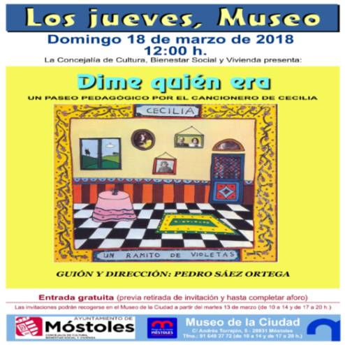 El Museo de la Ciudad, en el marco del programa "Los domingos…Música", acoge, a las 12 horas, el recital "Dime quién era", un concierto pedagógico por el cancionero de Cecilia, con guión y dirección de Pedro Sáez Ortega.