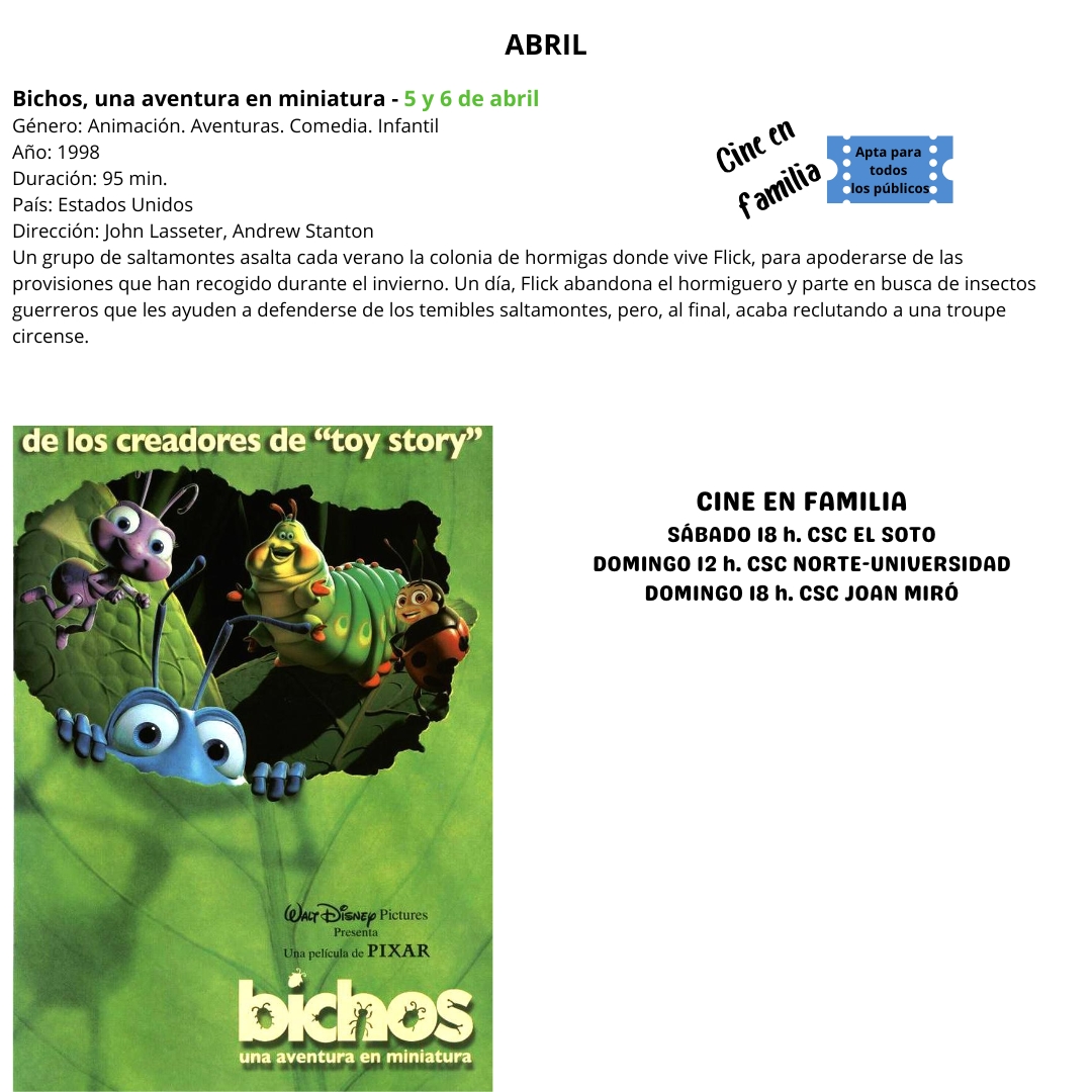 El programa "Cine en familia" estará protagonizada esta semana por "Bichos, una aventura en miniatura", que se podrá ver el sábado 5, a las 18:00 h, en el Centro Sociocultural El Soto y el domingo 6, a las 12:00 h en el Centro Sociocultural Norte-Universidad, y a las 18:00 h en el Centro Sociocultural Joan Miró.