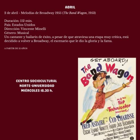 El programa Filmoteca trae esta semana la película "Melodías de Broadway 1955", que se proyectará el miércoles 2 a las 18:30 h en el Centro Sociocultural Norte-Universidad. El film narra la historia de un cantante y bailarín de éxito que, a pesar de atravesar una etapa muy crítica, está decidido a volver a Broadway, el escenario que le dio la gloria y la fama.