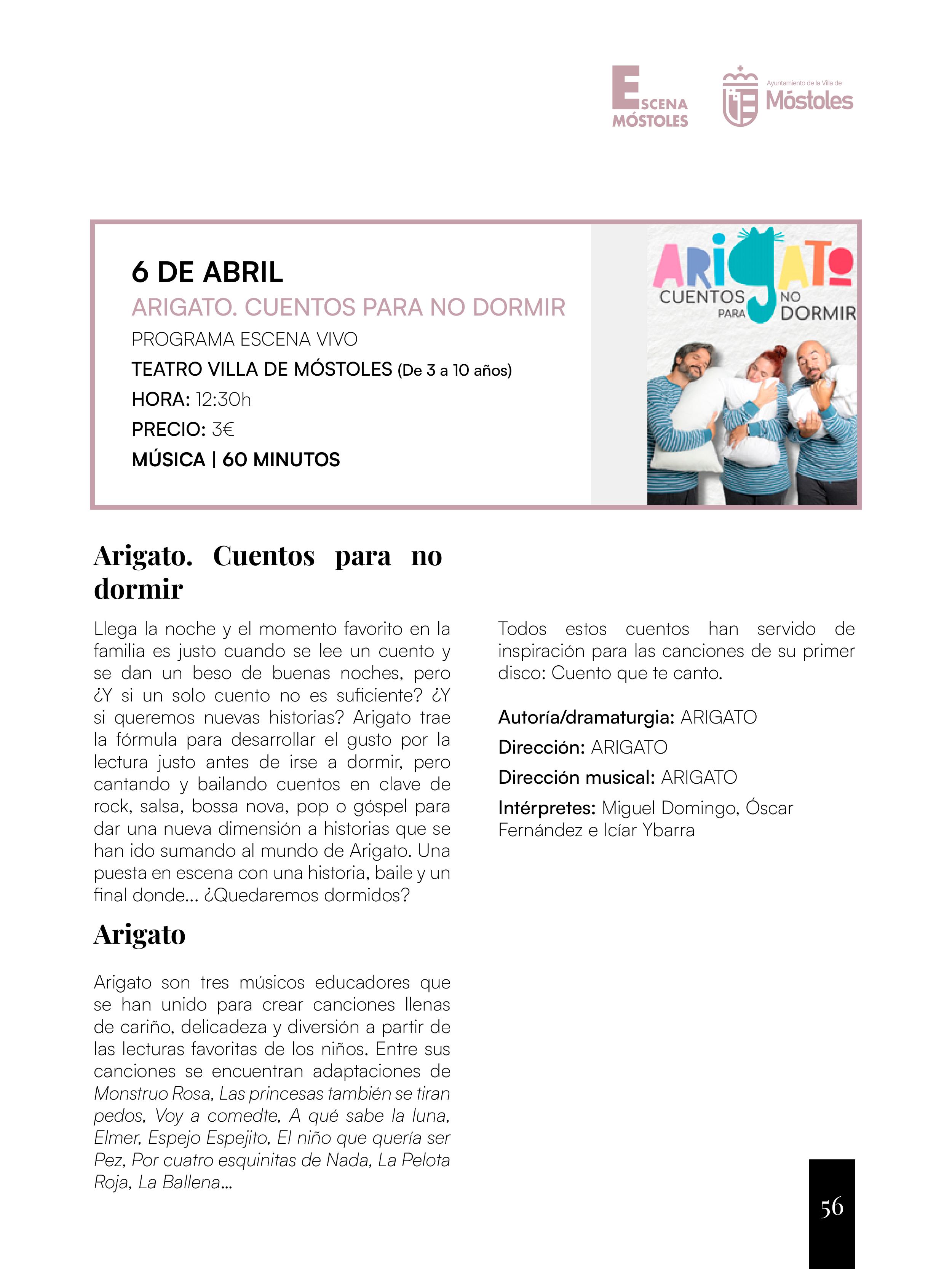 La programación cultural de la semana finaliza con "Arigato. Cuentos para no dormir", que se representará el domingo 6, a las 12:30 h, en el Teatro del Bosque. Arigato son tres músicos educadores que se han unido para crear canciones llenas de cariño, delicadeza y diversión a partir de las lecturas favoritas de los niños.