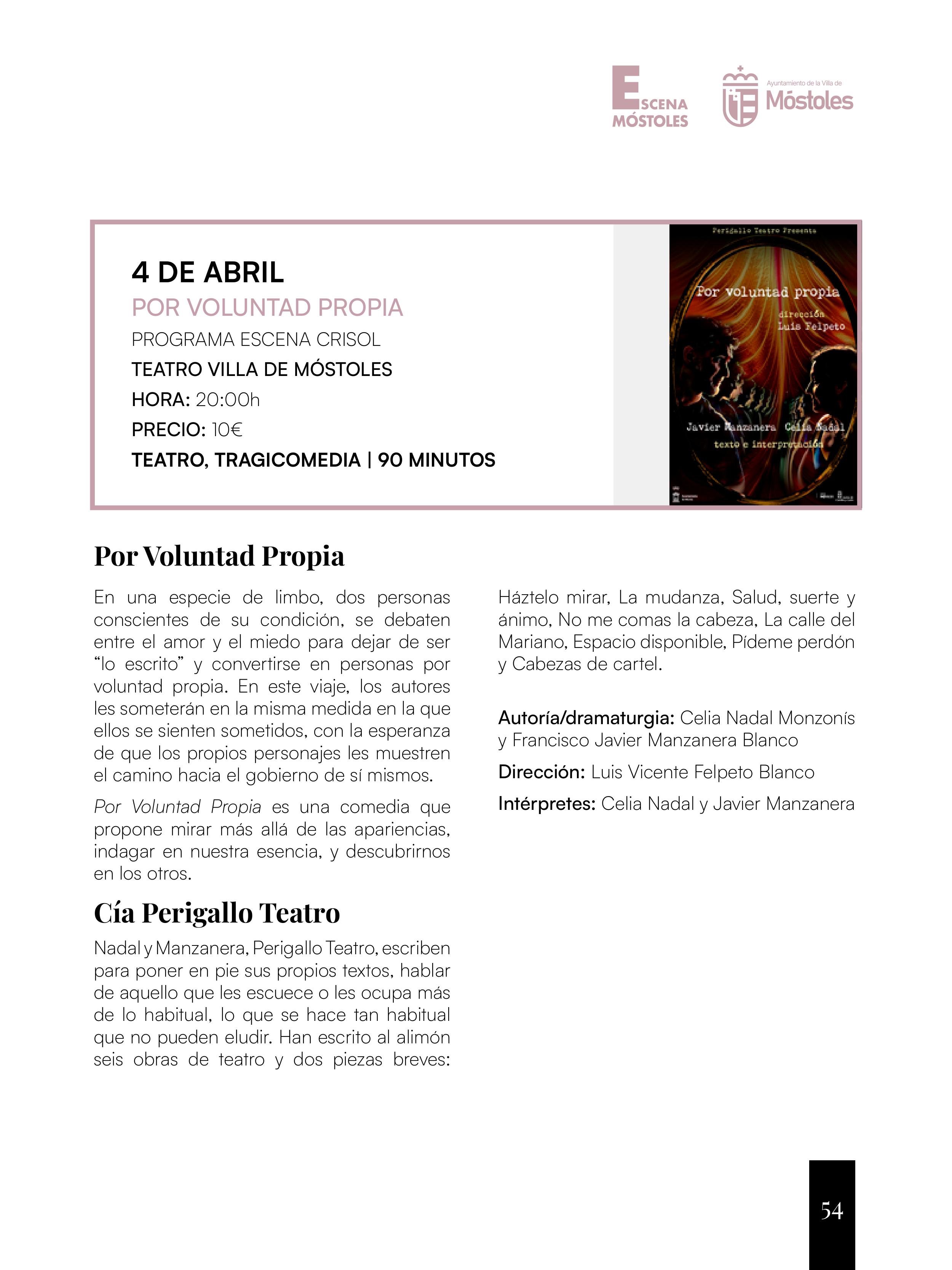Ese mismo día, el viernes 4, los actores Celia Nadal y Javier Manzanera llegan al Teatro Villa de Móstoles con "Por Voluntad Propia", dirigida por Luis Vicente Felpeto Blanco.