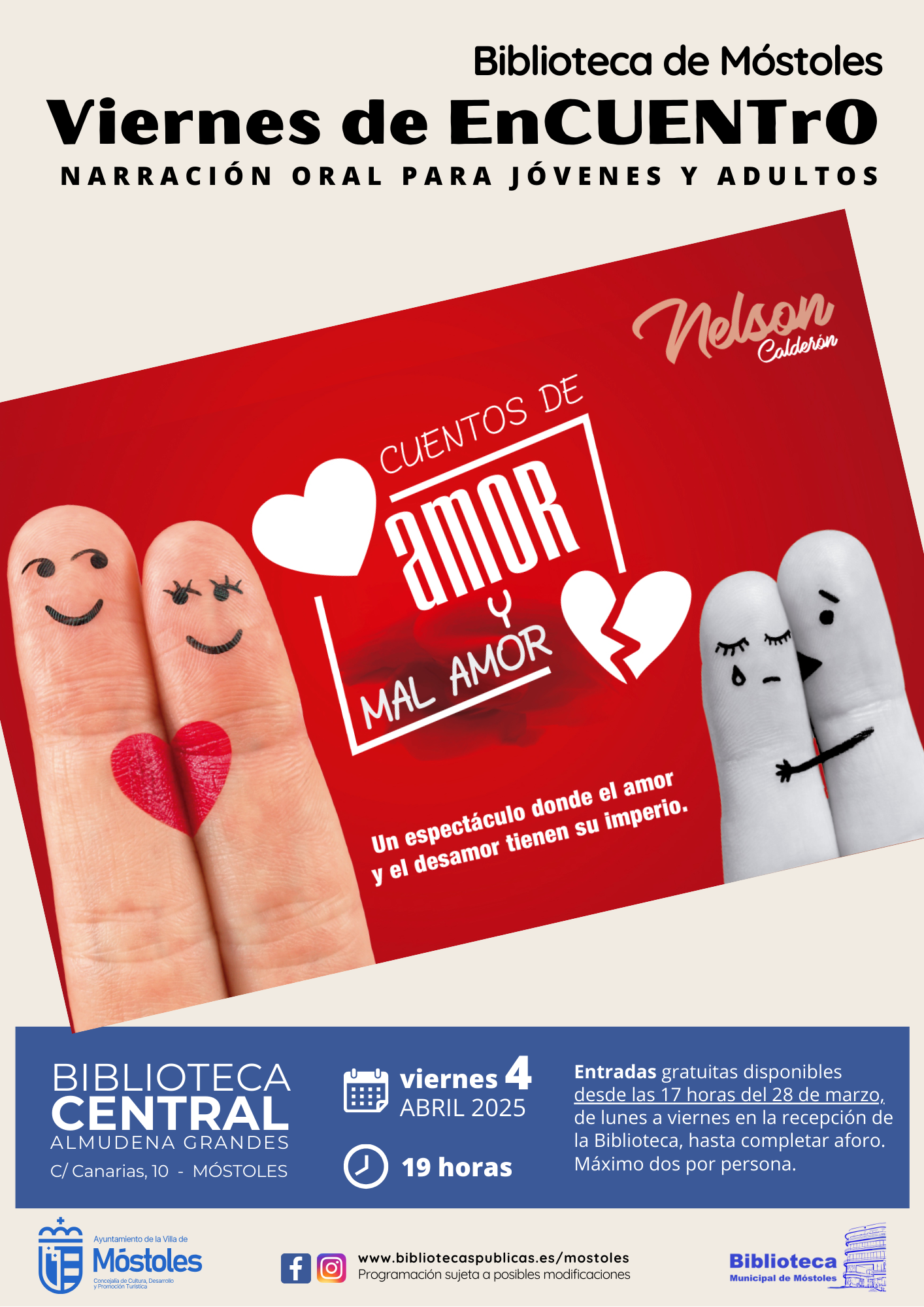 Dentro de la programación de Viernes de Encuentro, Nelson Calderón ofrecerá la narración oral para adultos "Cuentos de amor y mal amor". Será el viernes 4 a las 19:00 h en la Biblioteca Central.