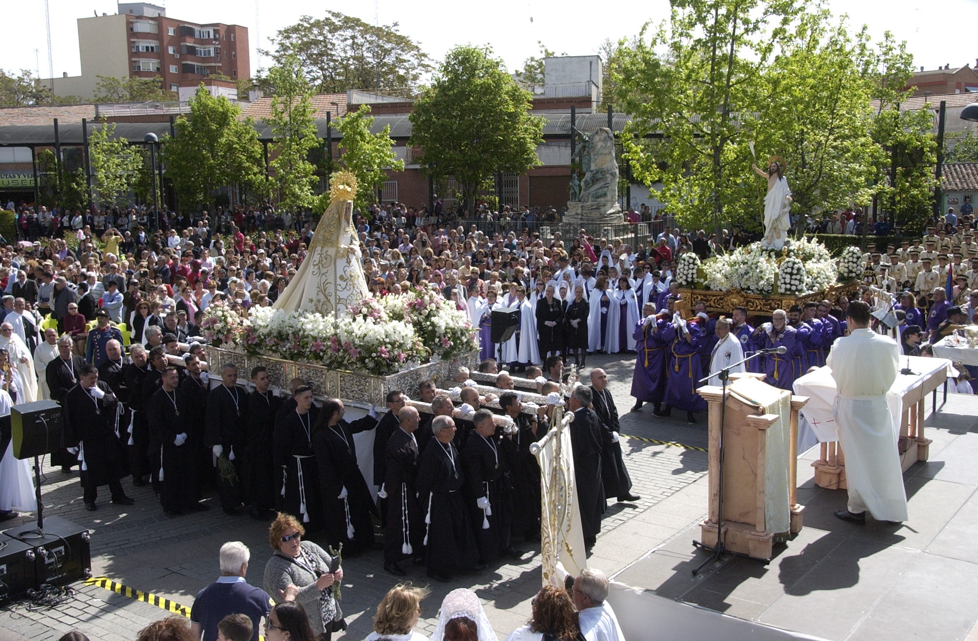 La edil y cientos de vecinos y visitantes acompañaron a la imagen de la Virgen de la Soledad que desde la iglesia de la Asunción recorrió la zona centro del municipio, en paralelo con la imagen de Cristo resucitado cuyo recorrido salió desde la Ermita de Nuestra Señora de los Santos. Ambas imágenes y sus respectivas comitivas se encontraron finalmente en la Glorieta de Cuatro Caminos.