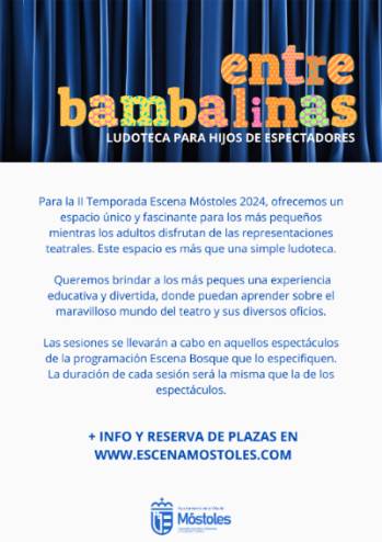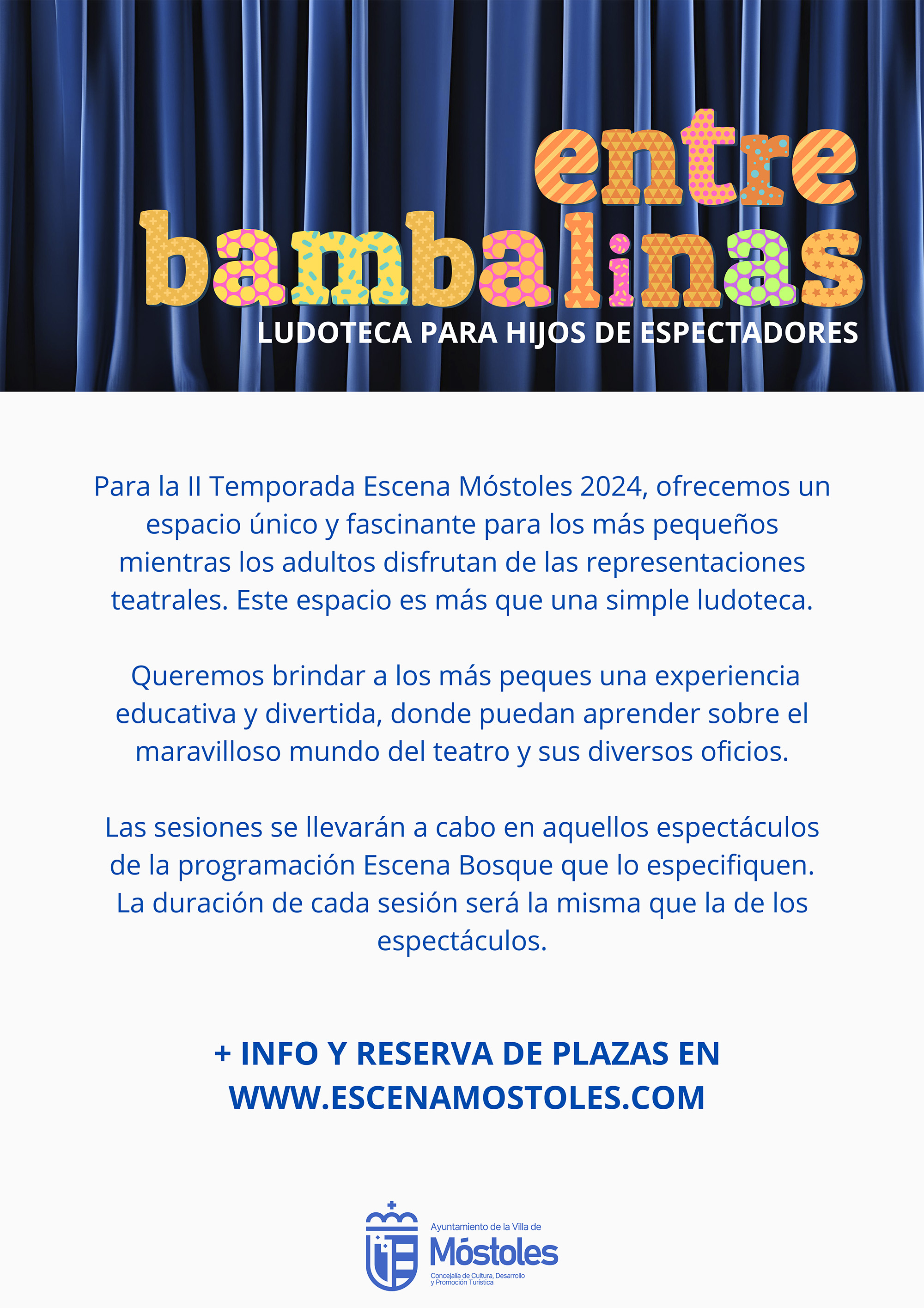 DESTACADA ENTRE BAMABALINAS ESCENA MOSTOLES 2024DESTACADA ENTRE BAMABALINAS ESCENA MOSTOLES 2024Además de con una cuidada y amplia programación, la II Temporada Escena Móstoles 2024 llega con "Entre bambalinas", una ludoteca infantil gratuita para hijos de espectadores. Comenzará este sábado 28 de septiembre para la función "4x4", de la compañía Ron Lalá.