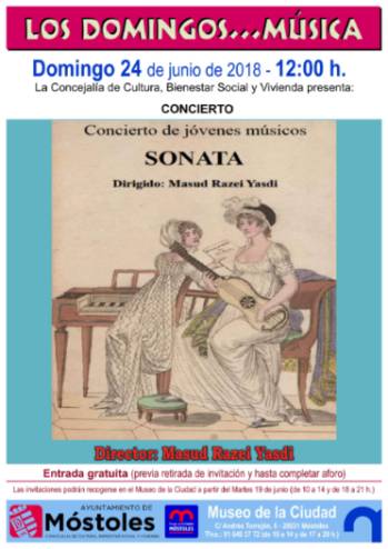 Concierto jovenes musicosImagen en alta resolución. Este enlace se abrirá mediante lightbox, puede haber un cambio de contextoConcierto jovenes musicosEl Ayuntamiento de Móstoles, a través del Museo de la Ciudad organizará el domingo 24 de junio, a las 12 horas, un concierto de jóvenes músicos, "Sonata", dirigido por Masud Razei Yasdi. Promovido por la Concejalía de Cultura, Bienestar Social y Vivienda, se trata de una propuesta desarrollada como experiencia para los jóvenes instrumentistas.
