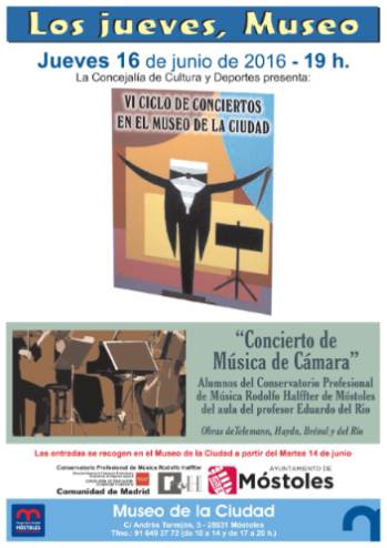 Imagen en alta resolución. Este enlace se abrirá mediante lightbox, puede haber un cambio de contextoEn el marco del VI Ciclo de Conciertos en el Museo de la Ciudad, la concejalía de Cultura y Deportes de Móstoles ofrecerá el jueves día 16 a las 19:00 horas un concierto de Música de Cámara. En este ocasión serán alumnos del aula de Música de Cámara dirigidos por el profesor Eduardo de Río quienes interpretarán obras de Bréval, Telemann, Haydn y del Río. Las entradas se reservan en el teléfono 916493772 y se recogen en el propio Museo a partir del martes 14 de junio.