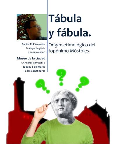 La concejalía de Cultura, Deportes y Festejos, presenta el jueves 3 de marzo, a las 18:30, dentro del ciclo `Los Jueves, Museo´, la conferencia `Tábula y fábula; origen etimológico de Móstoles´, impartida por Carlos R. Pasalodos. Las entradas se podrán retirar a partir del martes 1 de marzo en el museo de la ciudad, en el horario habitual del mismo.