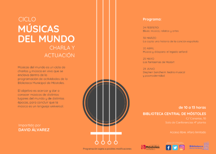Ciclo MÚSICAS EL MUNDO. Músicas del mundo es un ciclo de charlas y música en vivo que se enclava dentro de la programación de actividades de la Biblioteca Municipal de Móstoles.