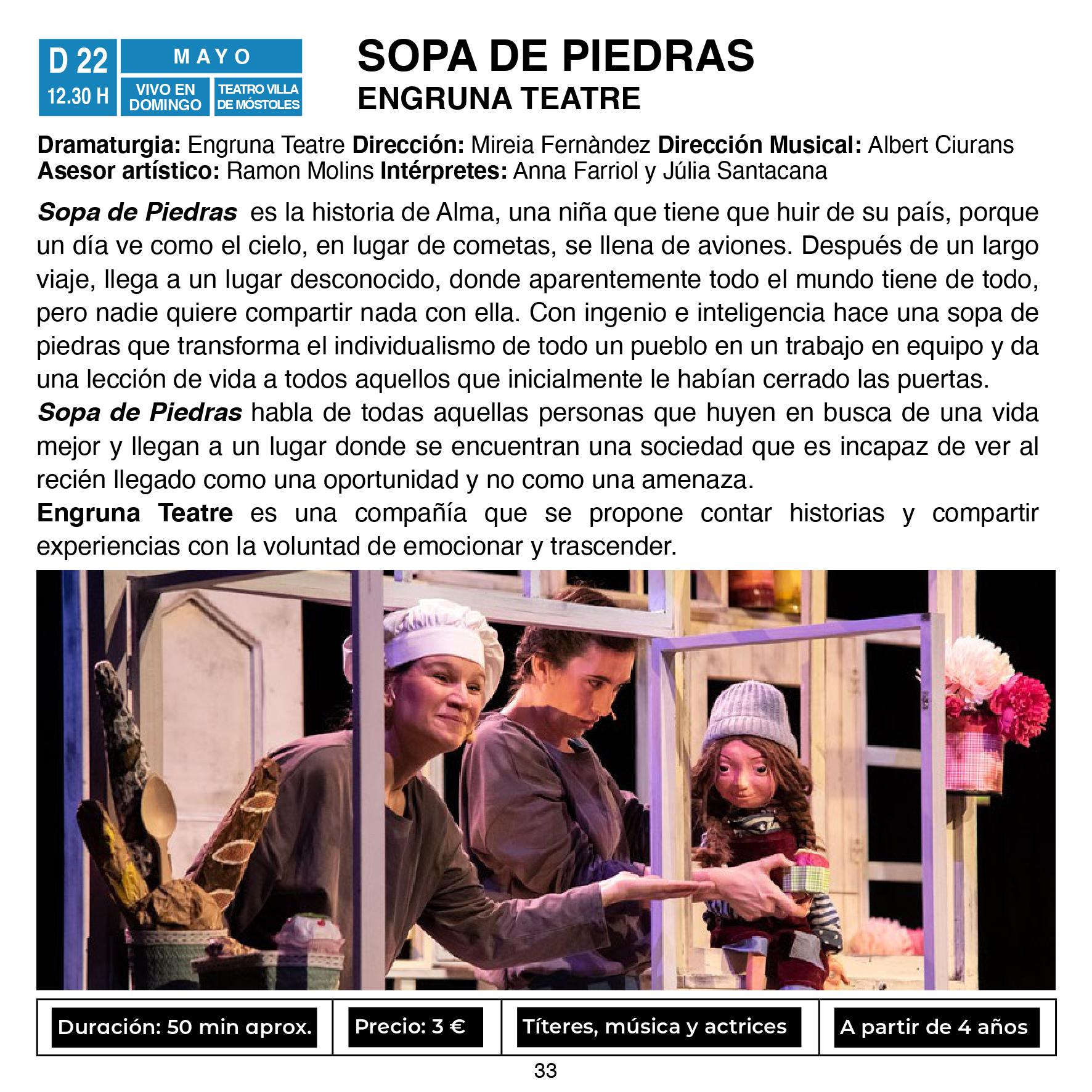 La cita con los espectáculos dirigidos al público infantil y familiar, es el domingo 22, a las 12.30 h., en el Teatro Villa de Móstoles, con la obra "Sopa de Piedras", de la compañía Engruna Teatre. Sopa de Piedras cuenta la historia de Alma, una niña que tiene que huir de su país, porque un día ve como el cielo, en lugar de cometas, se llena de aviones… La obra nos habla de todas aquellas personas que huyen en busca de una vida mejor y llegan a un lugar donde se encuentran una sociedad que es incapaz de ver al recién llegado como una oportunidad y no como una amenaza.