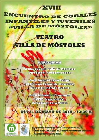 Cartel Encuentro de Corales día 31 niñosImagen en alta resolución. Este enlace se abrirá mediante lightbox, puede haber un cambio de contextoCartel Encuentro de Corales día 31 niñosEl Teatro Villa de Móstoles acoge el próximo 31 de mayo el XVIII Encuentro de Corales Infantiles y Juveniles Villa de Móstoles que contará con la participación del Grupo Juvenil Villa de Móstoles, el Coro Infantil - Juvenil León Felipe (Móstoles) y el Coro Infantil de Loranca (Ceip Fregaceros). El Encuentro está organizado por la Coral Villa de Móstoles, con la colaboración de la Concejalía de Educación, Cultura y Promoción Turística.