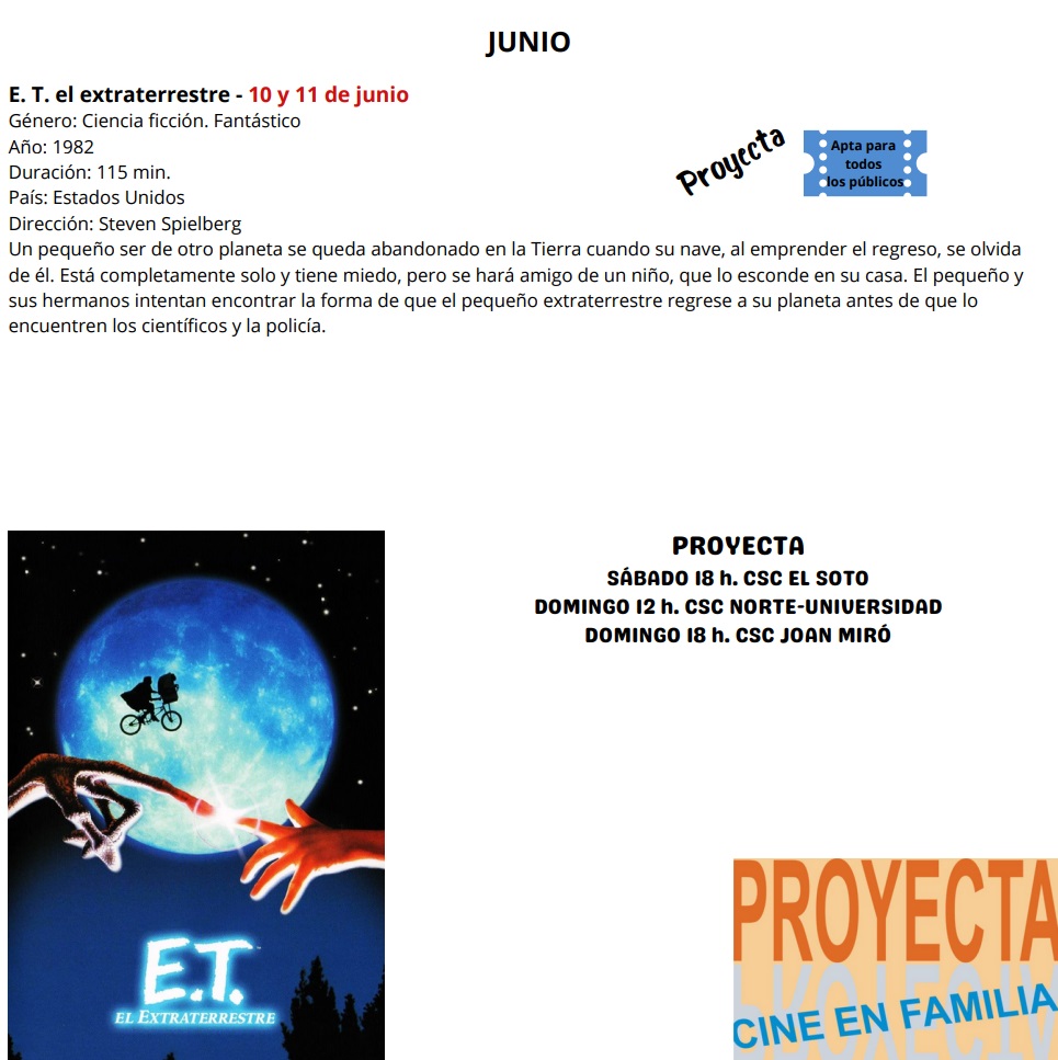 El fin de semana, las niñas y niños de Móstoles pueden seguir disfrutando de las mejores películas infantiles con el programa "Proyecta. Cine en familia". El sábado 10 y el domingo 11 se proyectará el clásico de Steven Spielberg, "E. T. El extraterrestre", ganadora de 4 Premios Oscar en 1982.