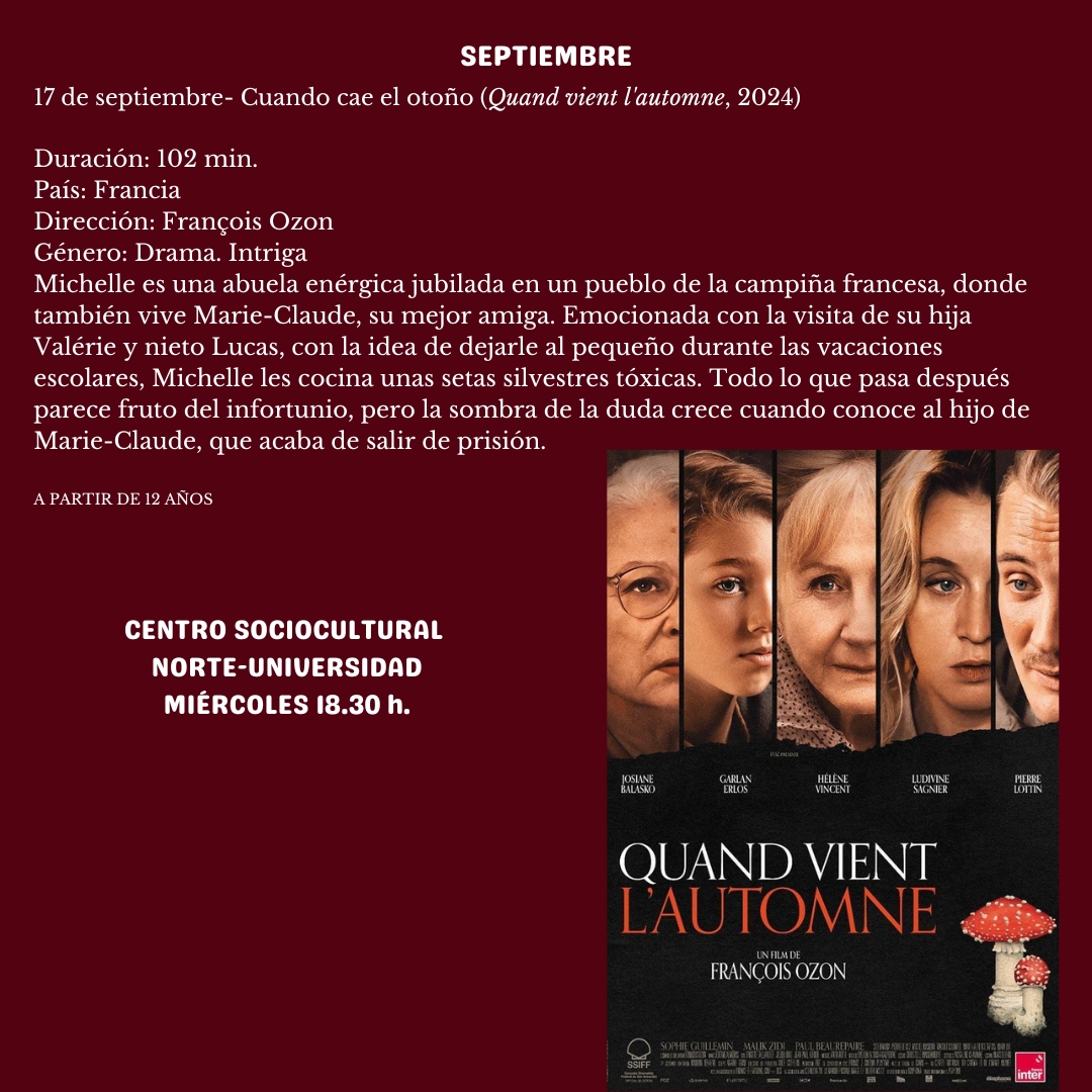 Dentro del ciclo Filmoteca, también el miércoles, se podrá asistir a la proyección de la película francesa "Cuando cae el otoño" (Quand vient l'automne, 2024), en el Centro Sociocultural Norte-Universidad, a las 18:30 h. La entrada es gratuita previa retirada de invitaciones en el propio centro desde el lunes 15 de septiembre.