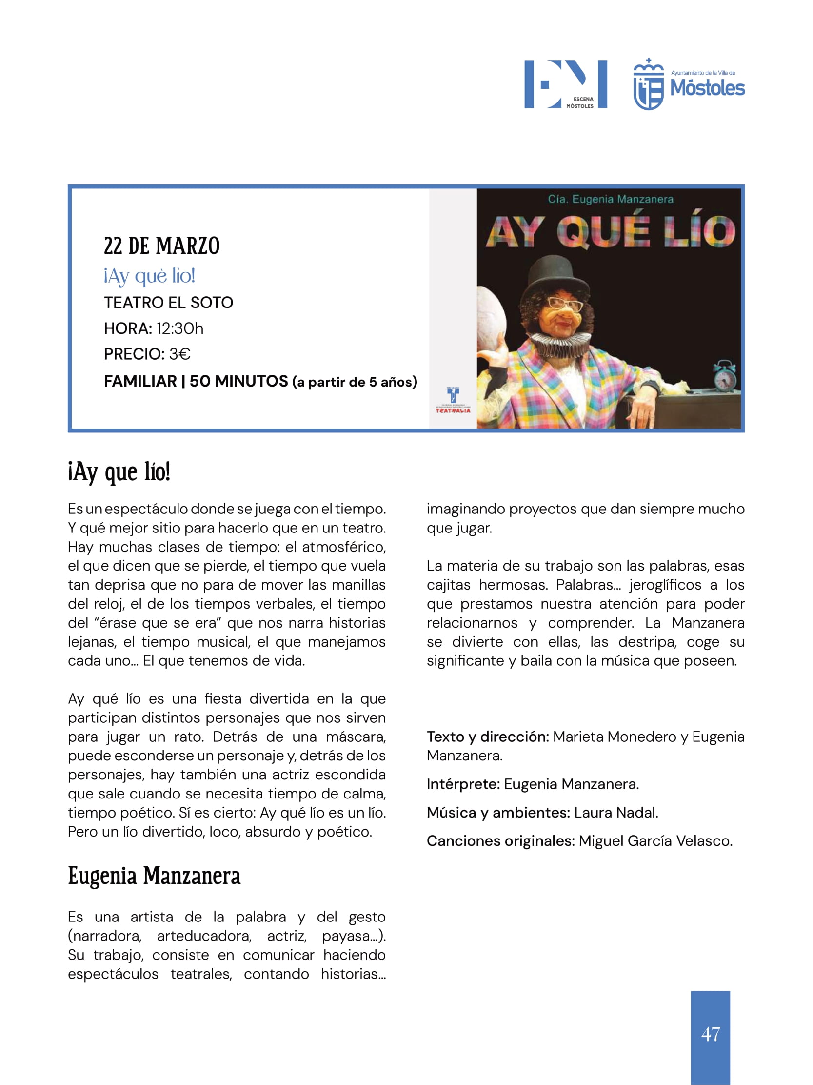 La oferta cultural concluye esta semana con "¡Ay qué lío!", teatro familiar a cargo de la compañía Eugenia Manzanera, en el Teatro El Soto el domingo 22 a las 12:30 h.