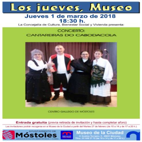 Imagen en alta resolución. Este enlace se abrirá mediante lightbox, puede haber un cambio de contextoEl Museo de la Ciudad acogerá el día 1 de marzo, a las 18.30 horas, la actuación del Grupo de "cantareiras" DOCABODACOLA del Centro Gallego de Móstoles.