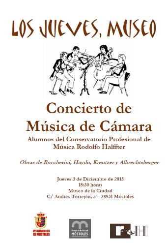 Imagen en alta resolución. Este enlace se abrirá mediante lightbox, puede haber un cambio de contextoEl próximo jueves día 3 de diciembre a las 18:30 horas, el Museo de la Ciudad ofrecerá un nuevo concierto dentro del ciclo "Los jueves, Museo". En esta ocasión serán alumnos del Conservatorio Profesional de Música Rodolfo Halffter de Móstoles del aula de Música de Cámara del profesor Eduardo del Río, quien también participará en el concierto.
