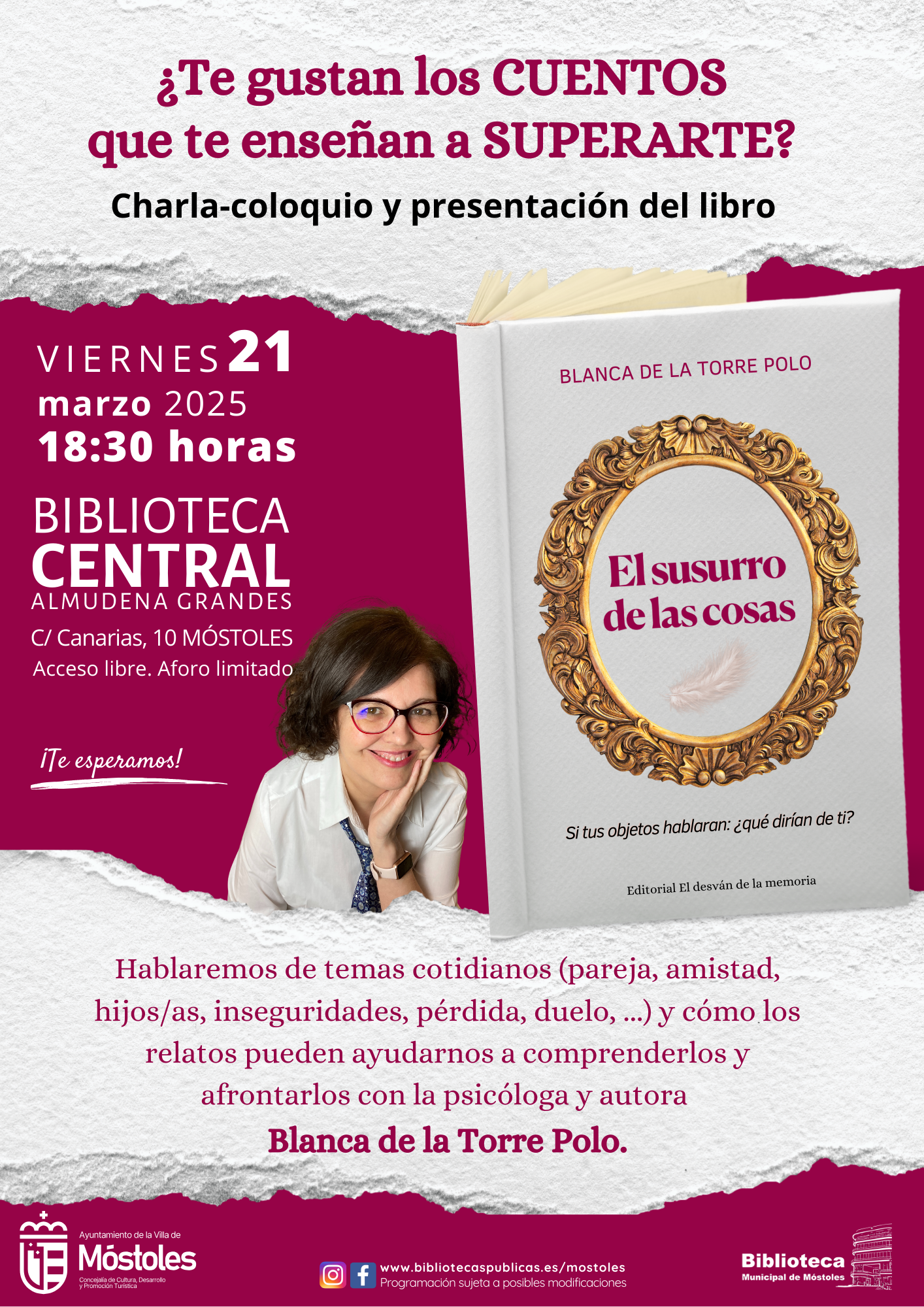 El viernes 21 la Biblioteca Central acoge a las 18:30 h la presentación del libro "El susurro de las cosas" de Blanca de la Torre Polo. La obra está compuesta por veinte relatos donde los objetos que usamos todos los días contarán las historias de sus dueños, mediante el humor, la nostalgia, la empatía o la esperanza, exponiendo temas como la inseguridad personal, la elección de pareja, el miedo, la pérdida o la superación.