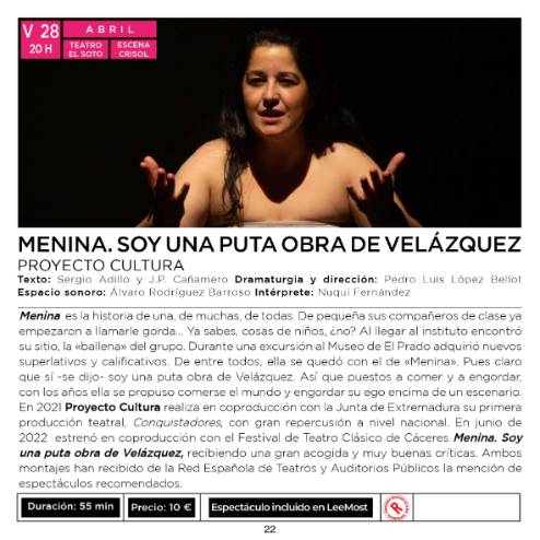 La programación de "Escena Móstoles" se inicia el viernes 28 a las 20:00 h en el Teatro del Soto con la obra "Menina, soy una puta obra de Velázquez".