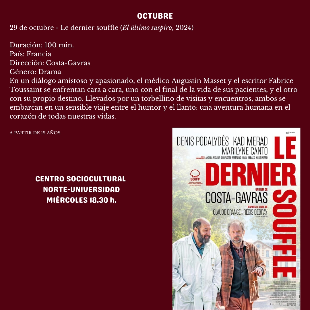 La película, que se proyectará el miércoles 29 a las 18:30 h en el Centro Sociocultural Norte-Universidad, narra el diálogo de tono filosófico entre el doctor Augustin Masset y el reconocido escritor Fabrice Toussaint, quienes reflexionan sobre la vida y la muerte. A través de una sucesión de encuentros, el médico actúa como guía y el escritor como viajero, impulsado a enfrentar sus temores y angustias más profundas. Se trata de una danza poética donde cada paciente encarna un mosaico de emociones, risas y lágrimas… Un viaje hacia el corazón mismo de la existencia.