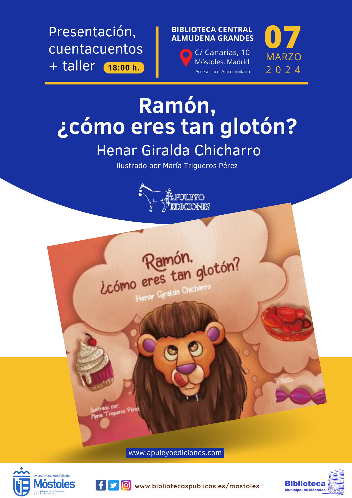 PRESENTACIÓN DEL LIBRO CON CUENTACUENTOS Y TALLER "RAMÓN, ¿CÓMO ERES TAN GLOTÓN?" de Henar Giralda Chicharro en la Biblioteca Central, a las 18:00 horas.