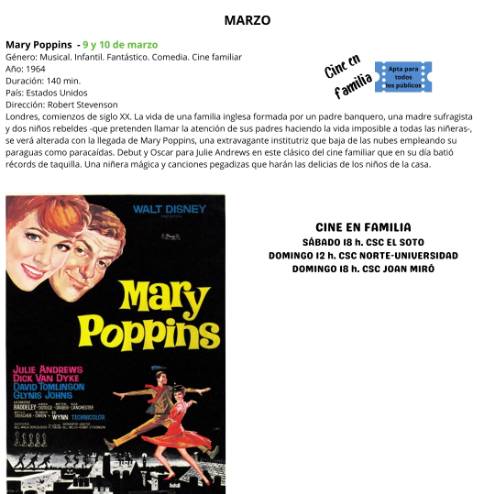 CINE EN FAMILIA. Programa organizado para ver en familia esas películas de siempre de nuevo con los hijos, pero esta vez en pantalla grande. En el Centro Sociocultural El Soto, a las 18 horas.