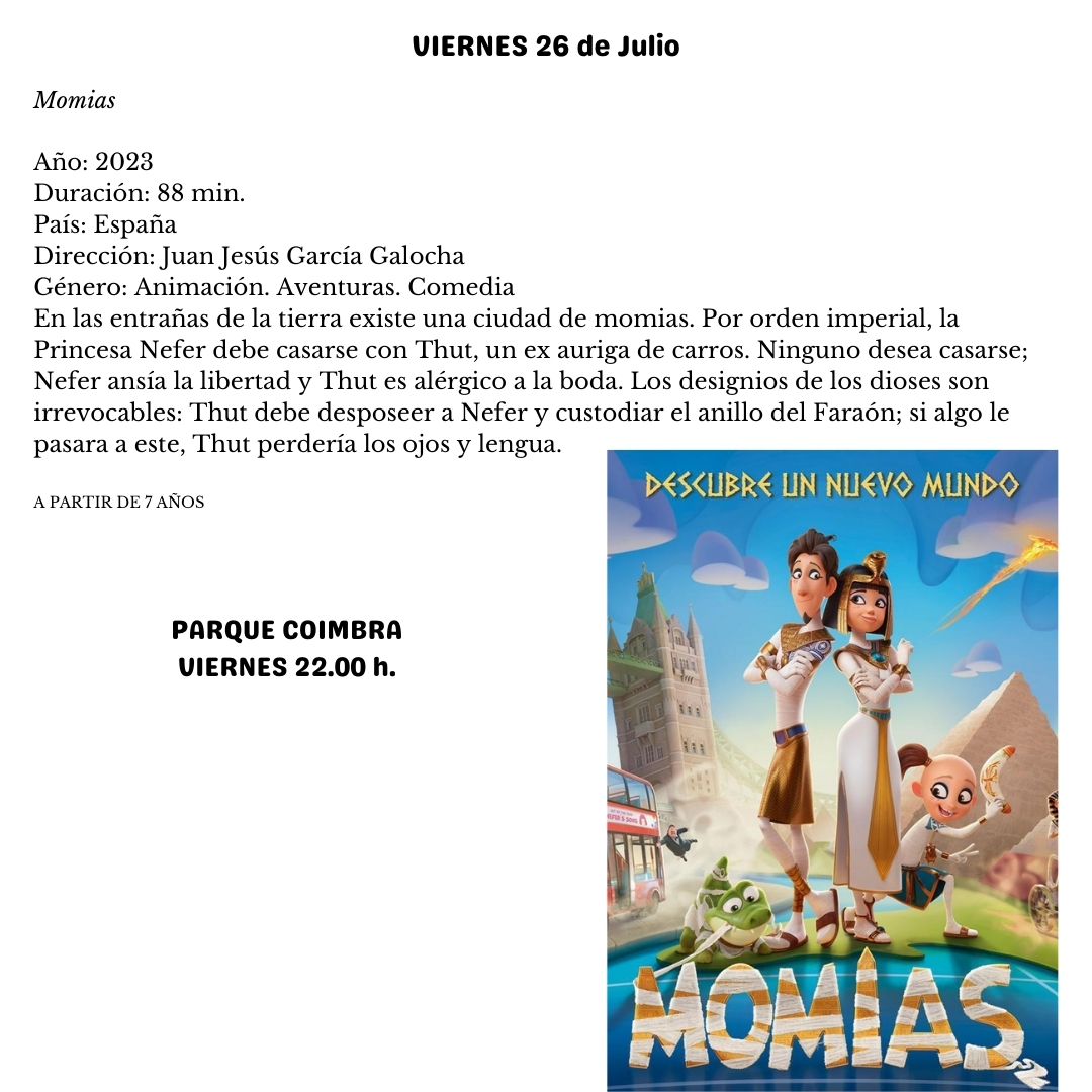 La primera proyección tendrá lugar el viernes 26 de julio y será la comedia de animación "Momias". Esta historia está ambientada en una ciudad habitada por momias, en la que la Princesa Nefer debe casarse con Thut, un ex auriga de carros, por orden imperial. Pero ninguno desea casarse. Nefer porque ansía la libertad y Thut porque es alérgico a la boda. Pero los designios de los dioses son irrevocables y Thut debe desposeer a Nefer y custodiar el anillo del Faraón, que les harán vivir unas divertidas aventuras.