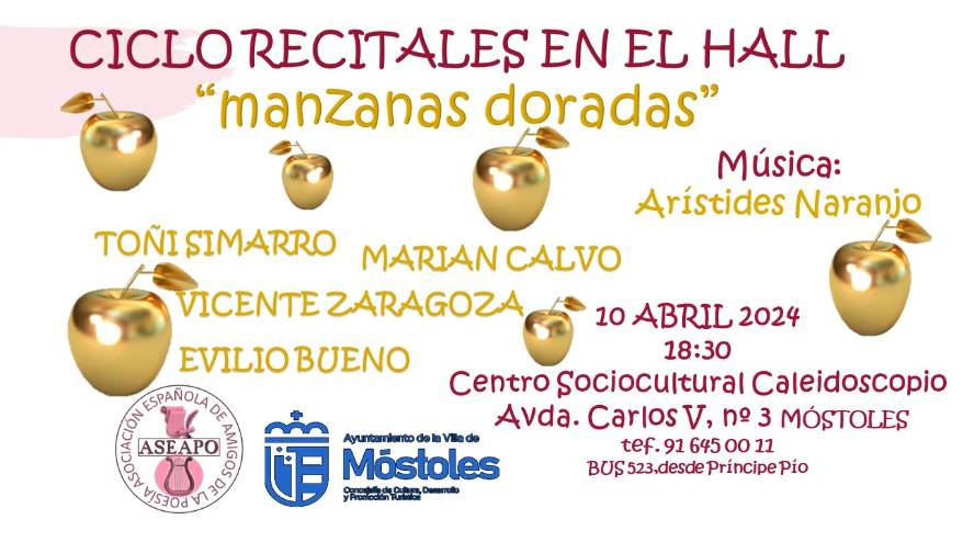 Esta jornada, bajo el título "Manzanas doradas", ofrecerá, de 18:30 h a 19:30 h, este recital que aúna las voces de poetas y un cantante que ofrecerán momentos de deleite para los sentidos. En esta ocasión, intervendrán Vicente Zaragoza Sesmero, Antonia Simarro, Marian Castellanos y Evilio Bueno, recordando tanto poemas de grandes autores como propios, combinando la música y la voz de Arístides Naranjo.