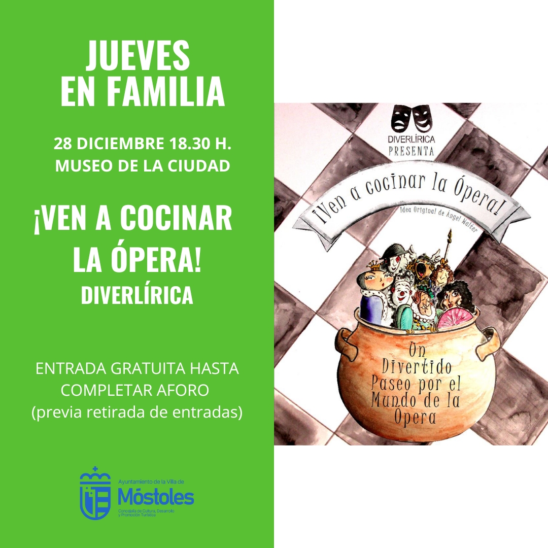 JUEVES EN FAMILIA, actuaciones gratuitas de pequeño formato para la familia. A las 18.30 horas, en el Museo de la Ciudad. Puesta en escena de DIVERLÍRICA Y SU CONCIERTO DIDÁCTICO "¡VEN A COCINAR LA ÓPERA!".