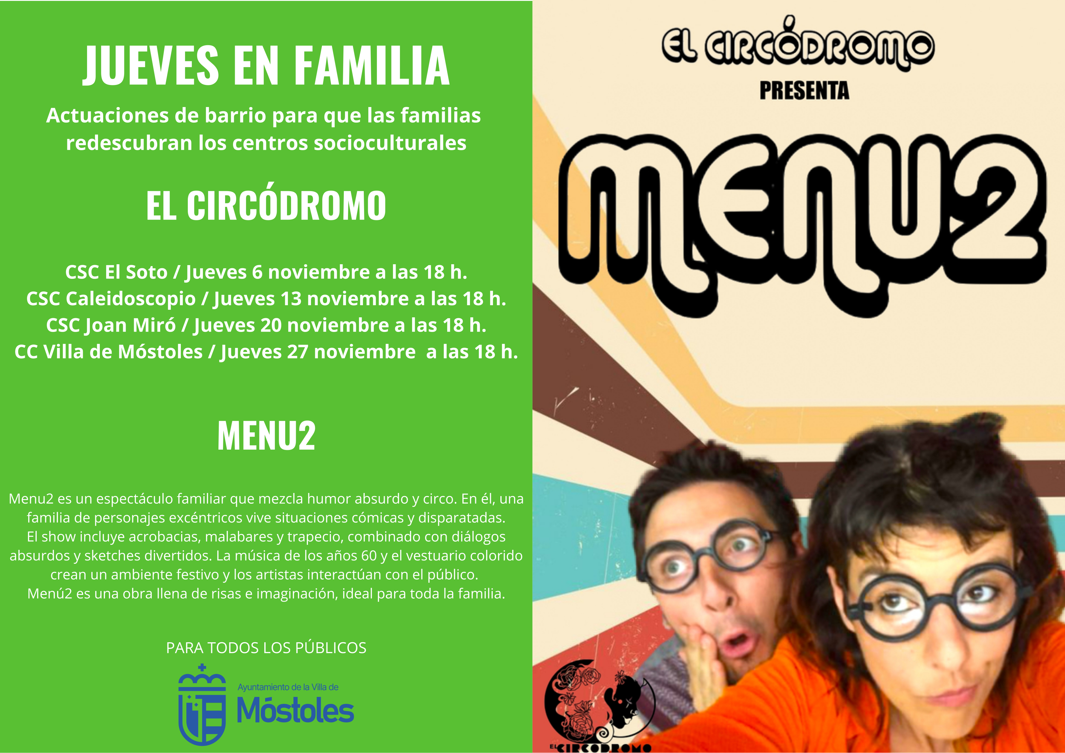 destacada noticia Jueves en Familia noviembre Circódromodestacada noticia Jueves en Familia noviembre CircódromoEl Ayuntamiento de Móstoles, a través de la Concejalía de Cultura, Desarrollo y Promoción Turística, continúa con la programación de Jueves en Familia y que este mes de noviembre centrará su temática en el mundo circense.