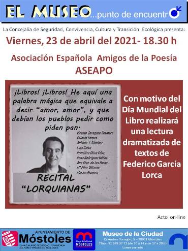 En el Museo de la Ciudad tendrá lugar el recital "Lorquianas", lectura dramatizada de textos de Federico García Lorca a cargo de la Asociación Española de Amigos de la Poesía. Realizado con motivo del Día Mundial del Libro. Se podrá seguir online a través de la página web del Museo de la Ciudad, apartado Museo Virtual.