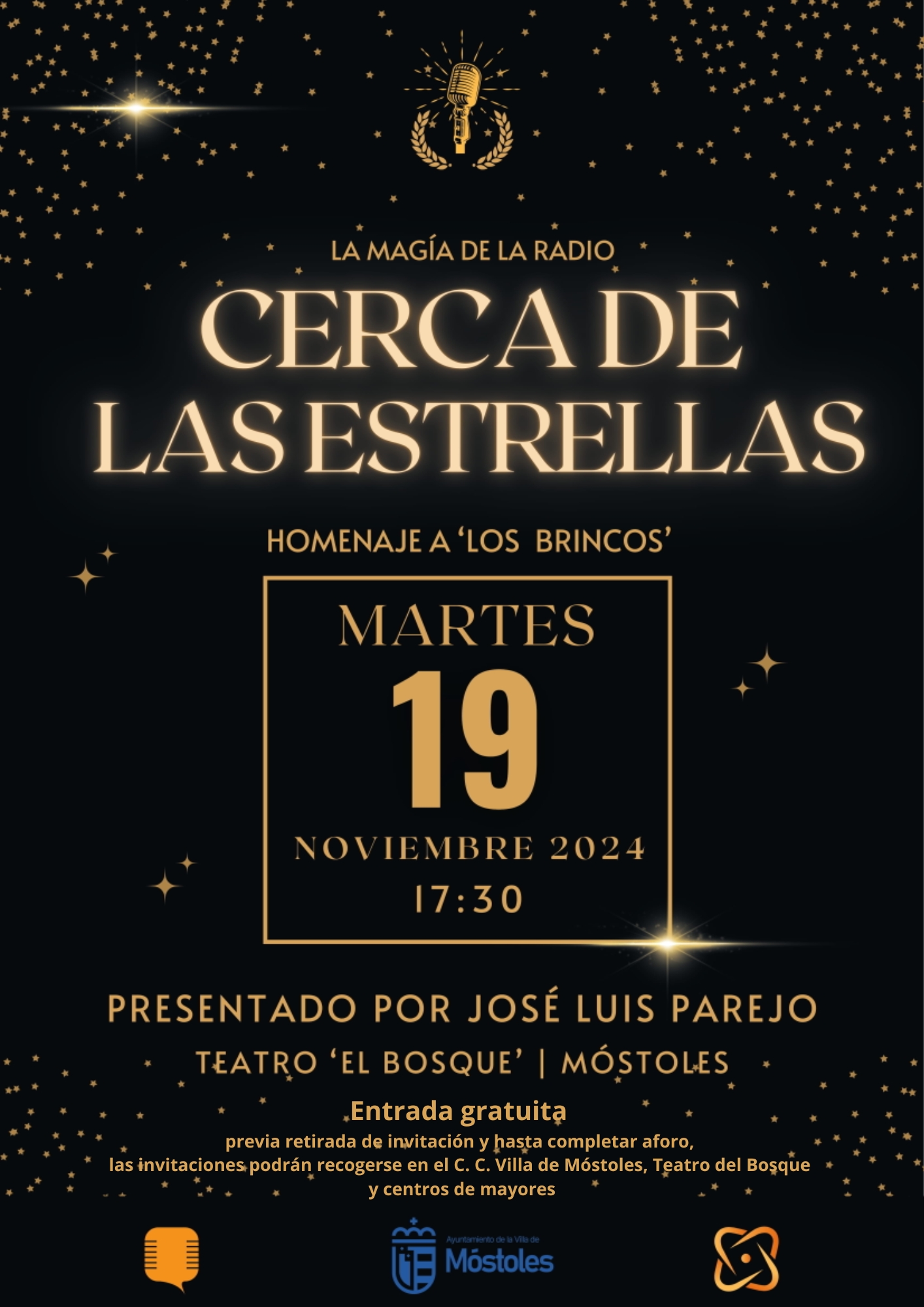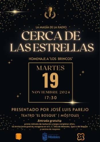 Por la tarde, a las 17:30 h, en el Teatro del Bosque se celebrará un homenaje al mítico grupo "Los Brincos", dentro del programa "Cerca de las estrellas", de Globo FM, organizado en colaboración con la Concejalía de Contratación, Mayores y Bienestar Social. Las entradas gratuitas se podrán recoger en el Centro Cultural Villa de Móstoles, Teatro del Bosque y en los centros de mayores.