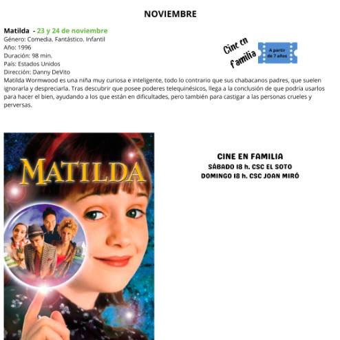 Dentro de la programación de Cine en familia, el sábado 23 se proyectará la película "Matilda", en el Centro Sociocultural El Soto, a las 18:00 h, con entrada gratuita y para todos los públicos, y también podrá verse el domingo en el Centro Sociocultural Joan Miró, a las 18:00 h. La película, basada en la obra de Roald Dahl, y dirigida por Danny DeVito, cuenta la historia de una niña muy curiosa e inteligente, Matilda Wormwood, con dotes sobrenaturales que tiene que enfrentarse a los desprecios de sus mediocres padres que esperan deshacerse de ella lo antes posible. La niña sufrirá a la cruel directora Trunchbull, que odia a los niños, pero logrará salir airosa de todas las difíciles situaciones que la vida le va poniendo en el camino gracias a su gran inteligencia y a la ayuda de la señorita Honey que le ofrecerá todo su cariño y apoyo incondicional.