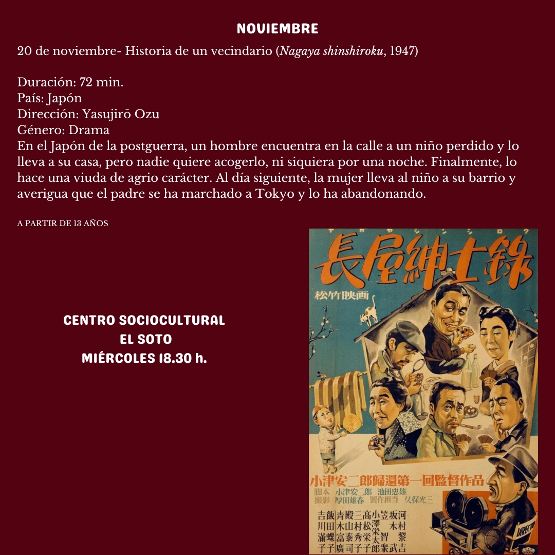 Dentro del ciclo Filmoteca, se proyectará la película "Historia de un vecindario", deNagaya shinshiroku, 1947, en el Centro Sociocultural El Soto a las 18:30 h. Entrada gratuita previa retirada de invitaciones en el propio centro.