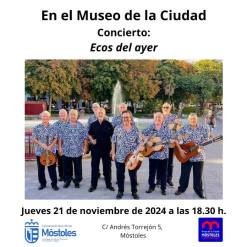 El mismo jueves se celebrará, en el Museo de la Ciudad, a las 18:30 h, el concierto de "Ecos del ayer", con diferentes instrumentos como guitarras, bandurrias, laudes, percusión, batería… que nos trasportan con sus canciones a los años 60 y 70 del siglo XX. La retirada de las invitaciones podrá hacerse desde el martes 19 en el horario del museo.