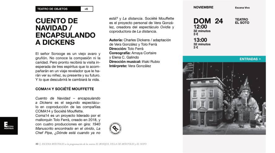 En el Teatro El Soto, el domingo se organizarán dos sesiones, a las 12:00 h y a las 13:00 h, del "Cuento de Navidad – encapsulando a Dickens", teatro de objetos de las compañías COMA14 y Société Mouffette. Una versión de la obra de Charles Dickens que protagoniza el señor Scrooge, un viejo avaro y gruñón, sin compasión ni caridad que recibirá la visita inesperada de tres espíritus que lo acompañarán en un viaje revelador que le harán ver su niñez, su presente y su futuro y que le transformarán.