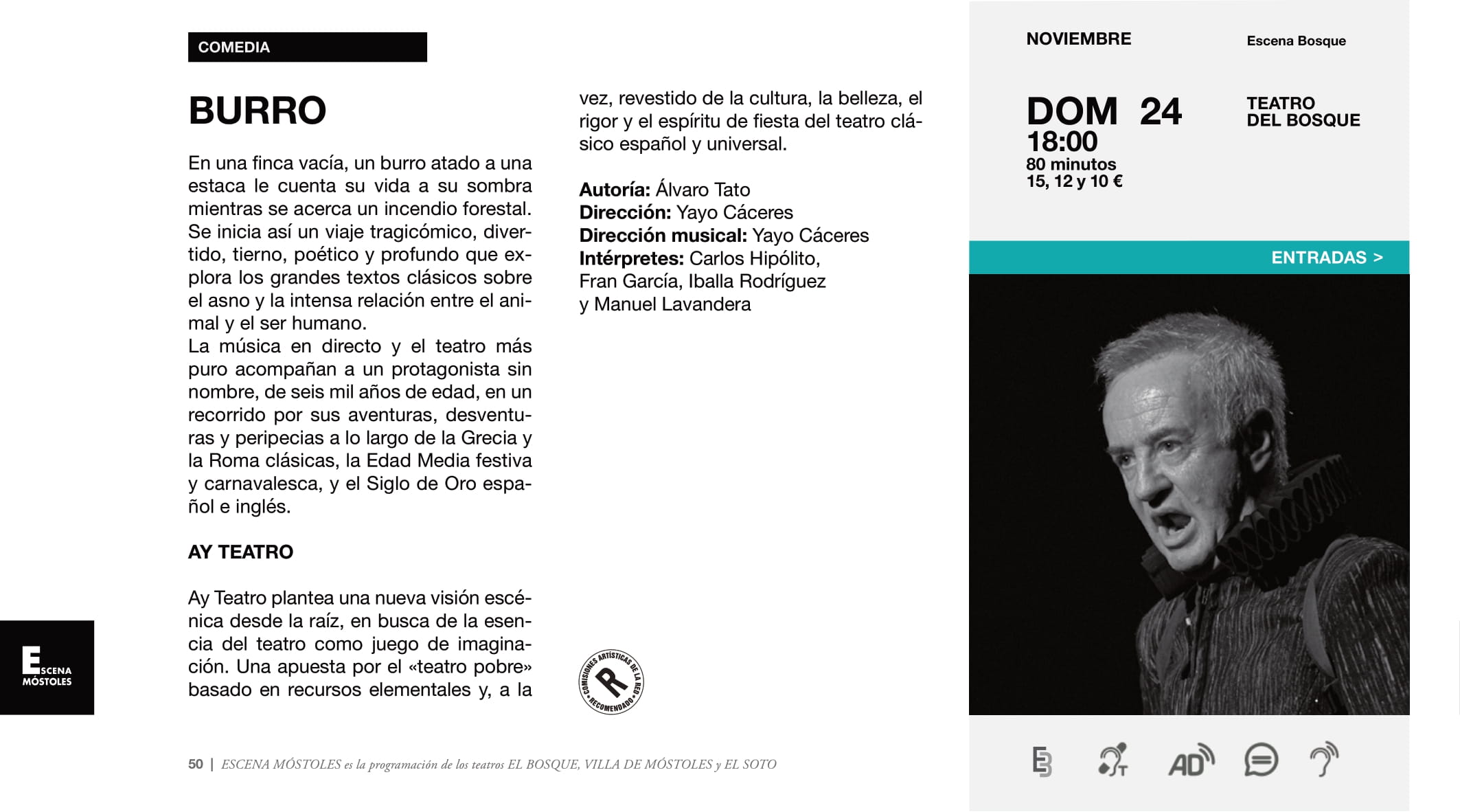 La agenda cultural, organizada por el Ayuntamiento de Móstoles, a través de la Concejalía de Cultura, Desarrollo y Promoción Turística, para la semana del 18 al 24 de noviembre, ofrecerá en el Teatro del Bosque, la obra "Burro", protagonizada por el reconocido actor Carlos Hipólito.