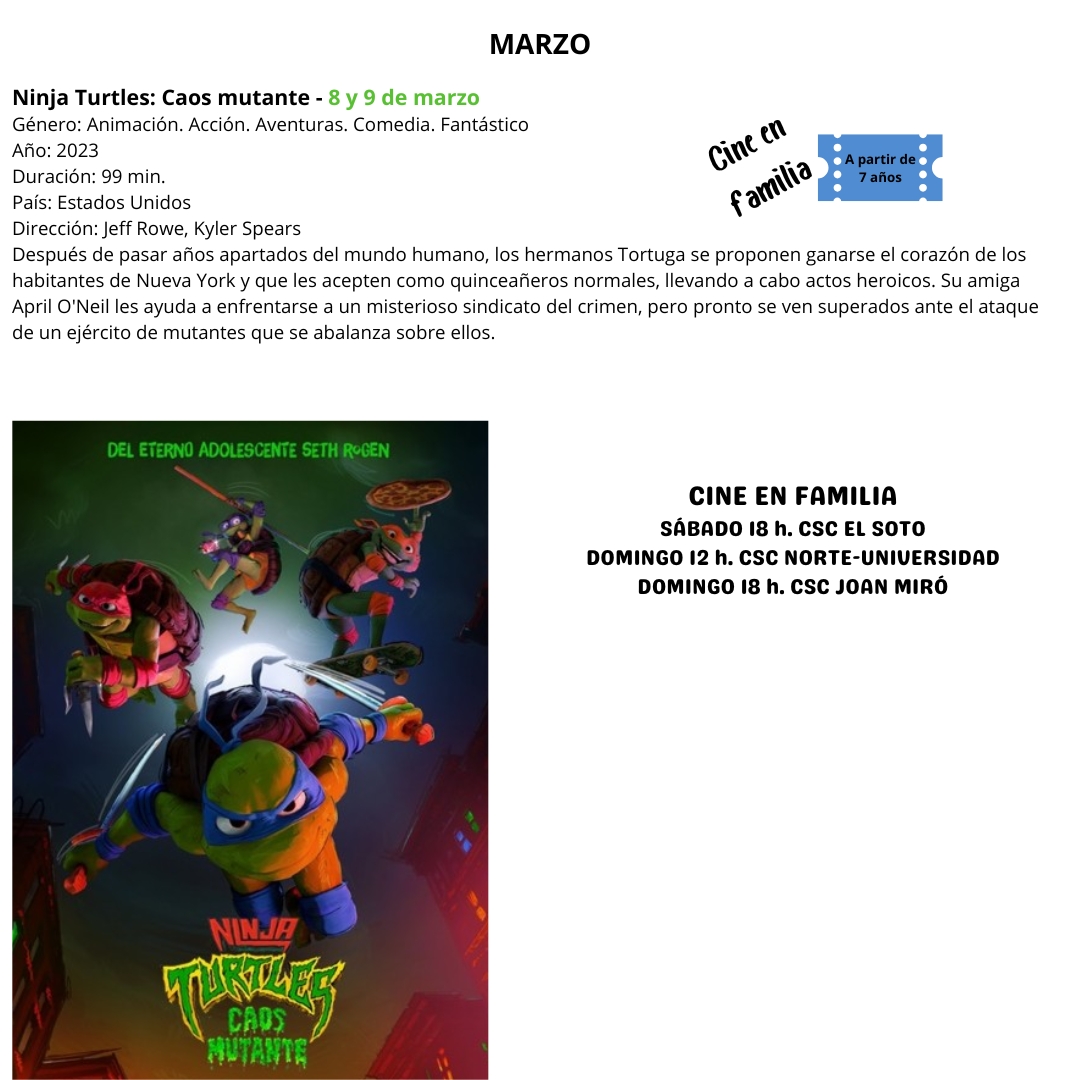 El programa "Cine en familia" está protagonizado esta semana por "Ninja Turtles: Caos mutante", que se podrá ver el sábado 8, a las 18:00 h, en el Centro Sociocultural El Soto y el domingo 9, a las 12:00 h en el Centro Sociocultural Norte-Universidad, y a las 18:00 h en el Centro Sociocultural Joan Miró.