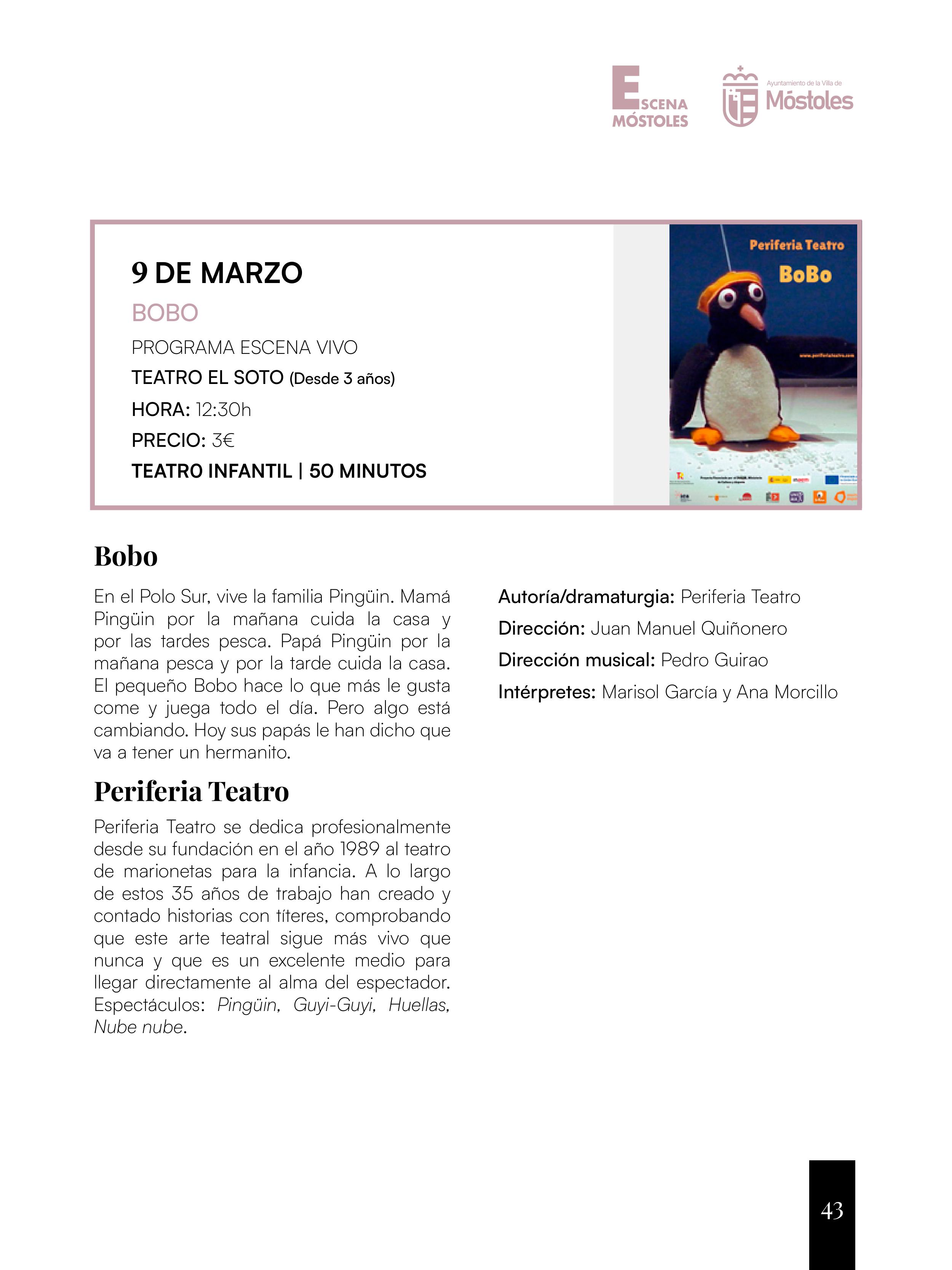 La programación semanal de Cultura finaliza con la obra infantil "Bobo", de la compañía Periferia Teatro. Se representará el domingo 9, a las 12:30 h, en el Teatro El Soto.