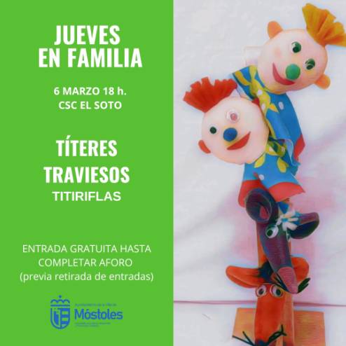 La compañía Titiriflas llega el jueves 6, a las 18:00 h, al Centro Sociocultural El Soto con el taller de títeres de dedo "Títeres traviesos", dentro de "Jueves en Familia". La entrada es gratuita, previa retirada de invitaciones en el propio centro a lo largo de la semana.