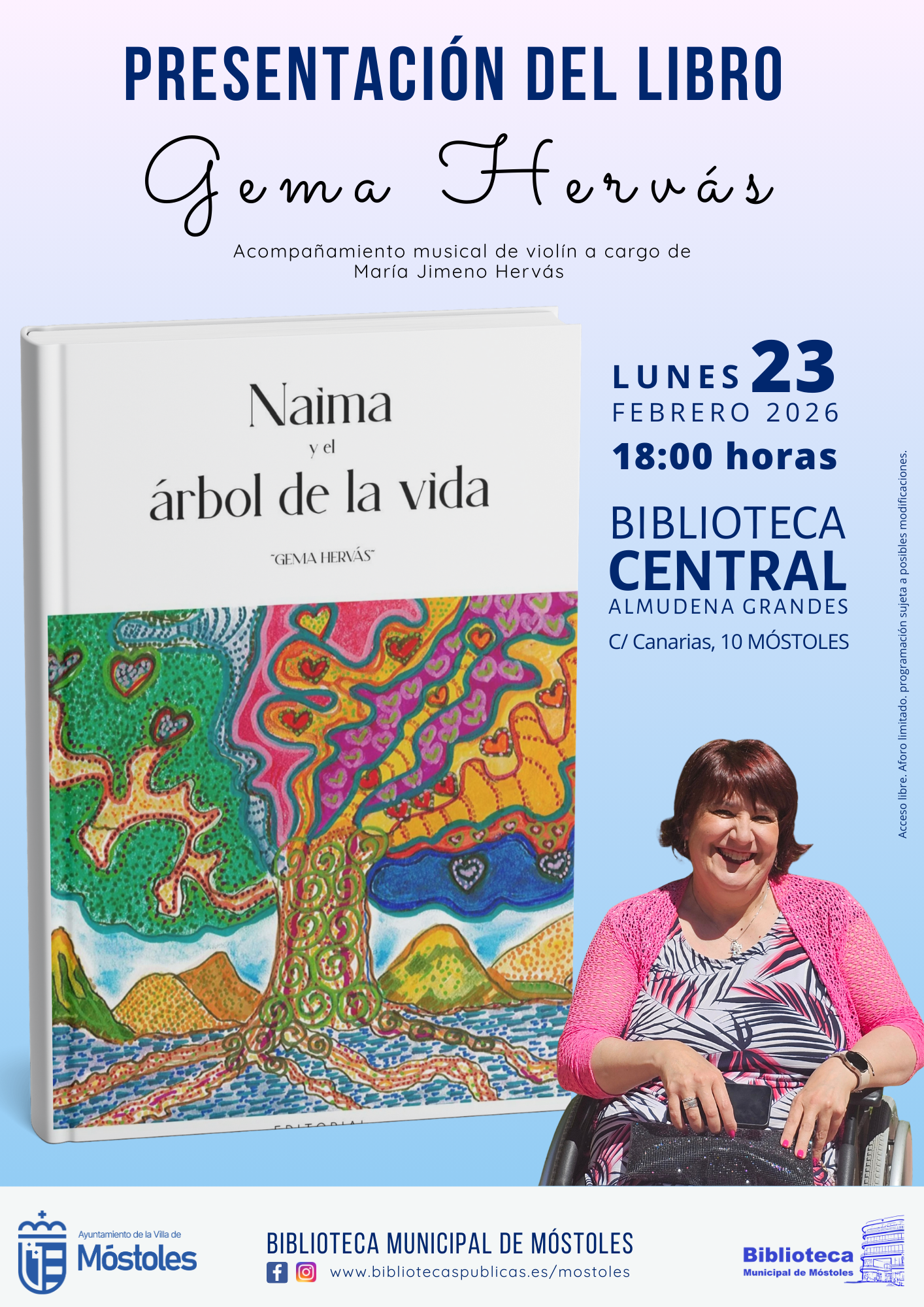 destacada agendadestacada agendaLa agenda cultural de la semana, del 23 de febrero al 1 de marzo, organizada por el Ayuntamiento de Móstoles, a través de la Concejalía de Cultura, Desarrollo y Promoción Turística, abre este lunes con la presentación del libro "Naima y el árbol de la vida", de Gema Hervás, en la Biblioteca Central Almudena Grandes, a las 18:00 h, con acompañamiento musical de violín a cargo de María Jimeno Hervás. La entrada libre hasta completar aforo.