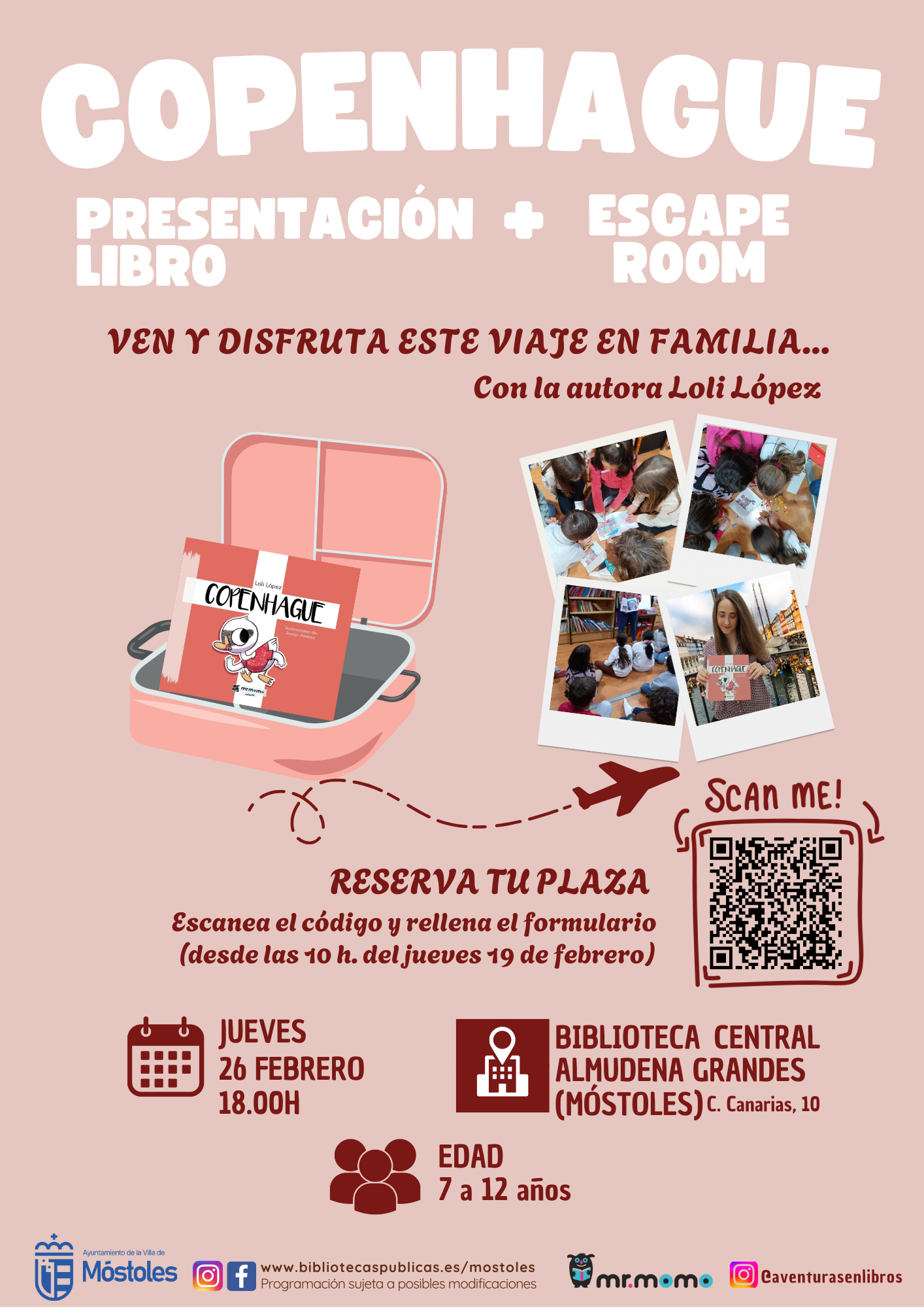 También el jueves 26 tendrá lugar la presentación del libro y Escape Room "Copenhague", para niños de 7 a 12 años, a las 18:00 h, a cargo de la autora Loli López, en la Biblioteca Central Almudena Grandes. Esta guía ilustrada para niños convierte la lectura en una aventura. A través de un Escape Room literario los lectores irán descubriendo la ciudad de Copenhague, un lugar lleno de historia, monumentos y un montón de curiosidades, mientras resuelven pruebas.