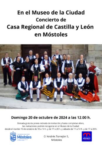 • El Ayuntamiento de Móstoles, a través de la Concejalía de Cultura, Desarrollo y Promoción Turística, ofrecerá el domingo 20 de octubre, a las 12:00 h, un concierto a cargo de la Casa Regional de Castilla y León, que mostrará el folclore de su tierra protagonizado por la jota castellanoleonesa.
