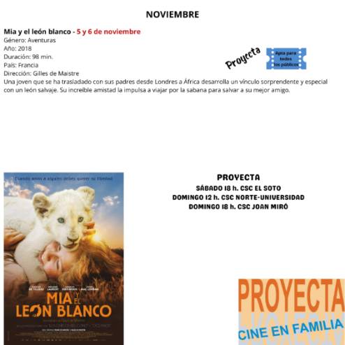 Además, este fin de semana, dentro del programa "Proyecta. Cine en familia", se ofrecerá a los más pequeños la película "Mia y el león blanco". Una cinta de aventuras dirigida por Gilles de Maistre, en la que una joven que se ha trasladado con sus padres desde Londres a África desarrolla un vínculo sorprendente y especial con un león salvaje. Su increíble amistad la impulsa a viajar por la sabana para salvar a su mejor amigo.