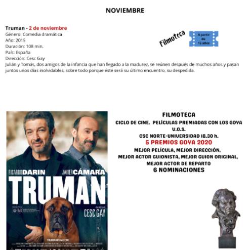 Dentro del programa "Filmoteca", comienza un ciclo de cine español con películas premiadas en los Goya en el Centro Sociocultural Norte-Universidad. Se inaugurará el miércoles 2 de noviembre a las 18:30 h con la cinta "Truman".