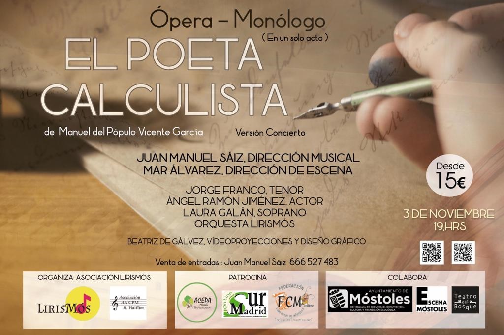 Dentro de la programación de Escena Móstoles, el jueves 3 de noviembre a las 19:00 h en el Teatro del Bosque, se presentará la ópera "El poeta calculista", de Manuel del Pópulo Vicente García.Está dirigida por Mar Álvarez, con coreografía de Malenia Mexia, dirección musical de Juan Manuel Sáiz Rodrigo e interpretación por parte de la compañía Lirismós