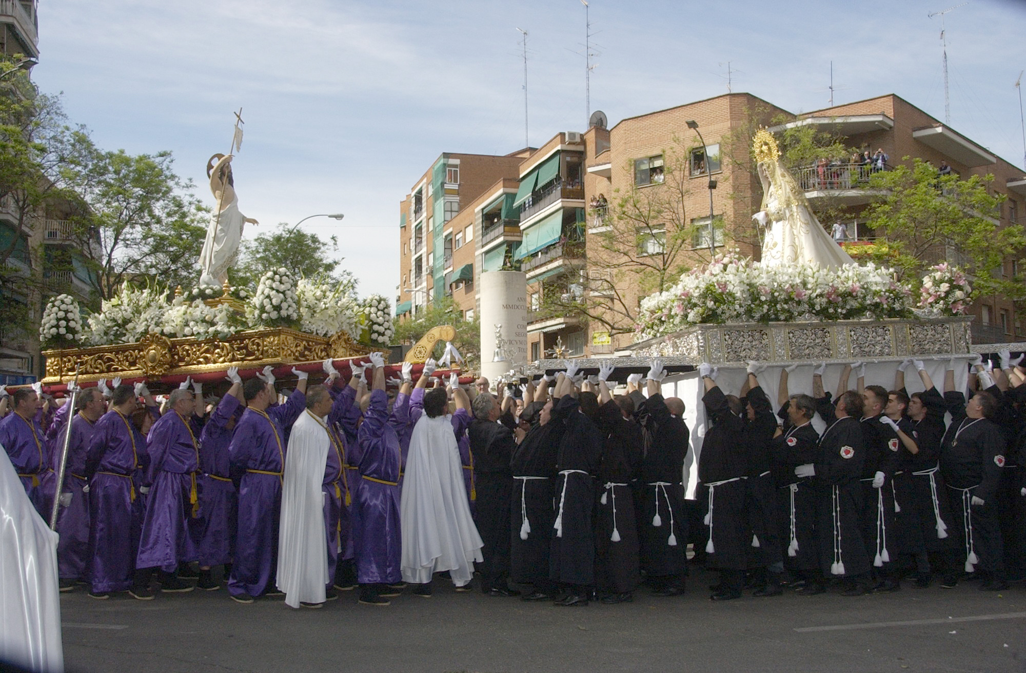 La edil y cientos de vecinos y visitantes acompañaron a la imagen de la Virgen de la Soledad que desde la iglesia de la Asunción recorrió la zona centro del municipio, en paralelo con la imagen de Cristo resucitado cuyo recorrido salió desde la Ermita de Nuestra Señora de los Santos. Ambas imágenes y sus respectivas comitivas se encontraron finalmente en la Glorieta de Cuatro Caminos.