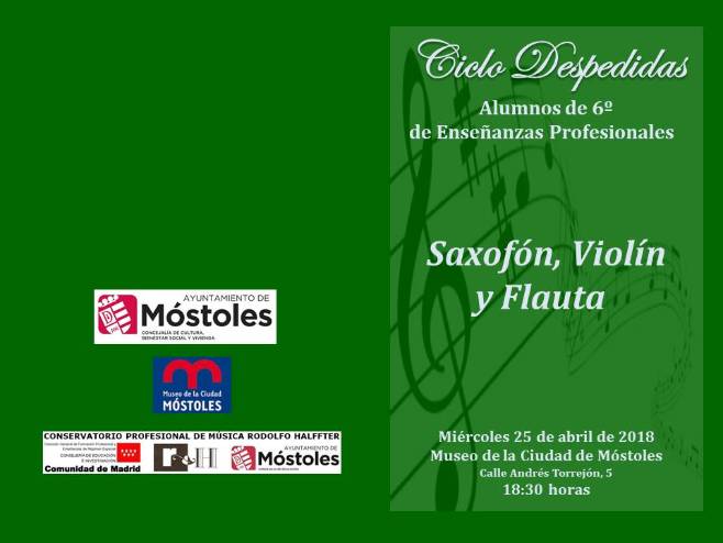 En esta ocasión tocarán los alumnos Pablo Recuero Lista (Saxofón), Ana Martín Corbo (Violín) y Marta Trigo Murillo y Marina Baltasar Molina (Flauta) interpretando obras de Creston, Bruch, Bach y Sancan.
