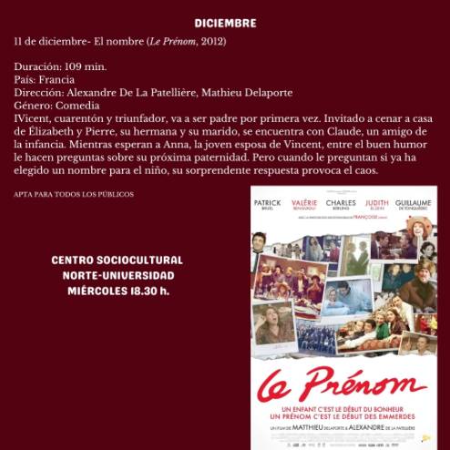 El miércoles 11 de diciembre, dentro del ciclo Filmoteca, se proyectará la película "El nombre", en el Centro Sociocultural Norte-Universidad, a las 18:30 h, con entrada gratuita previa retirada de invitaciones en el propio centro. Una comedia francesa que gira en torno a la paternidad de un cuarentón y triunfador que va a ser padre por primera vez.