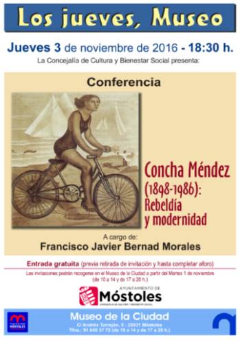 Imagen en alta resolución. Este enlace se abrirá mediante lightbox, puede haber un cambio de contextoLa Concejalía de Cultura y Bienestar Social presenta en el Museo de la Ciudad, el jueves 3 de noviembre a las 18:30h., la conferencia "Concha Méndez (1898-1986): rebeldía y modernidad"por Francisco Javier Bernad Morales. Las entradas se podrán retirar desde el martes 1 de noviembre en el Museo de la Ciudad.
